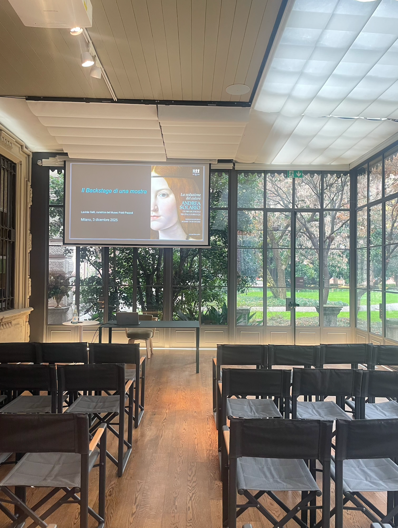Dall'idea iniziale ai contatti con altri musei, dalla gestione logistica alle relazioni con i prestatori, le assicurazioni, i trasporti speciali, fino all'allestimento delle opere. Si tratta di un mondo spesso invisibile, ma essenziale per il successo di un'esposizione museale. La dottoressa Galli come esempio ha utilizzato, nella sala dell'Orangerie, la recente mostra "La seduzione del colore. Andrea Solario e il Rinascimento tra Italia e Francia".